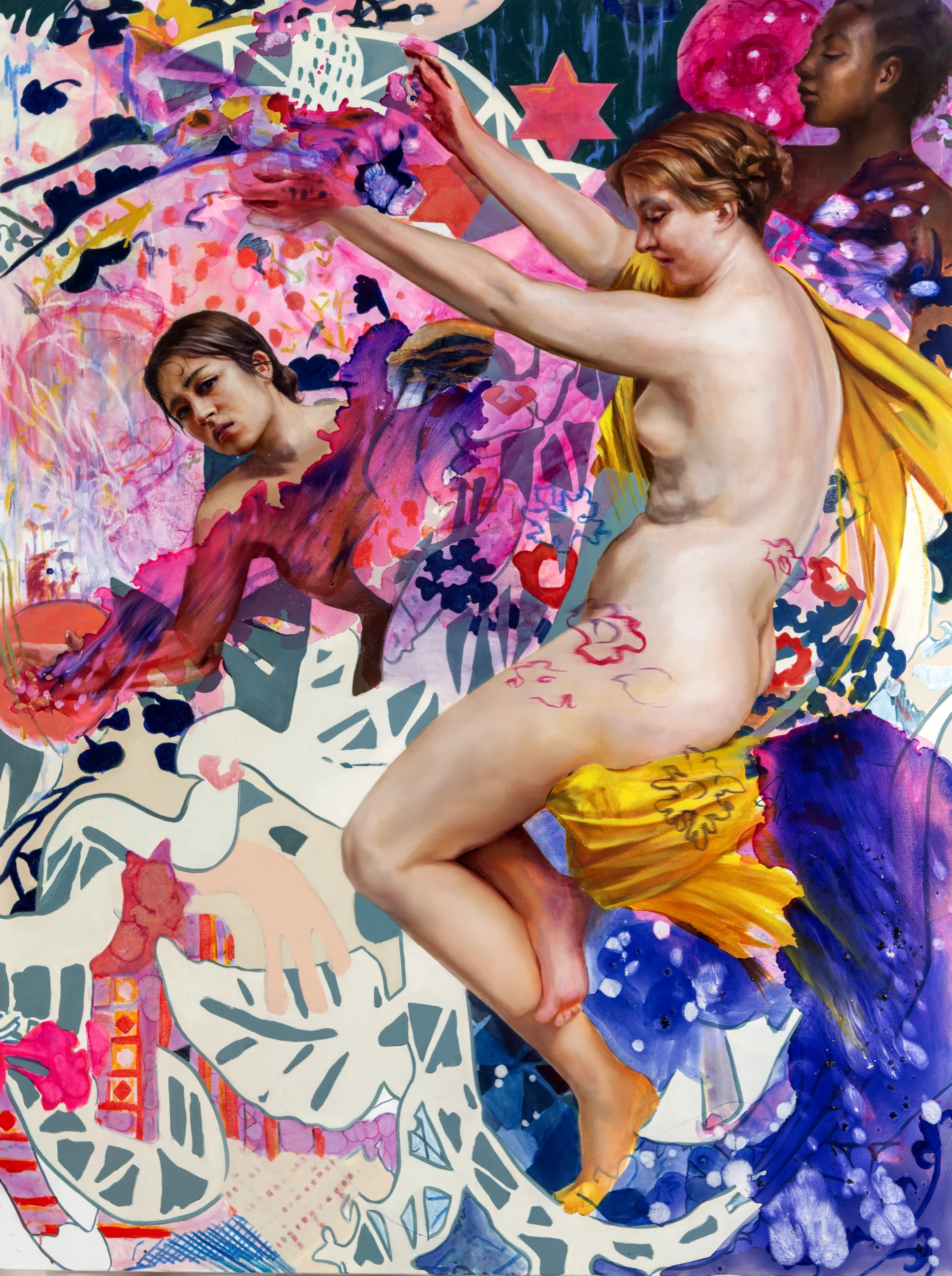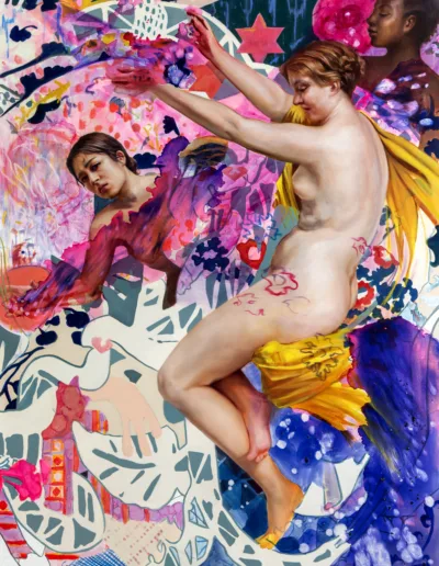In a style that weaves together realism and abstraction, Angela Fraleigh creates works that range from intimate portraits to monumental figure paintings. Exploring themes of gender, sexuality, femininity, and power dynamics, Fraleigh’s artworks feature women who are no longer forgotten historical figures or background characters bound by male-dominated narratives. The women Fraleigh depicts become daring protagonists in stories of their own.