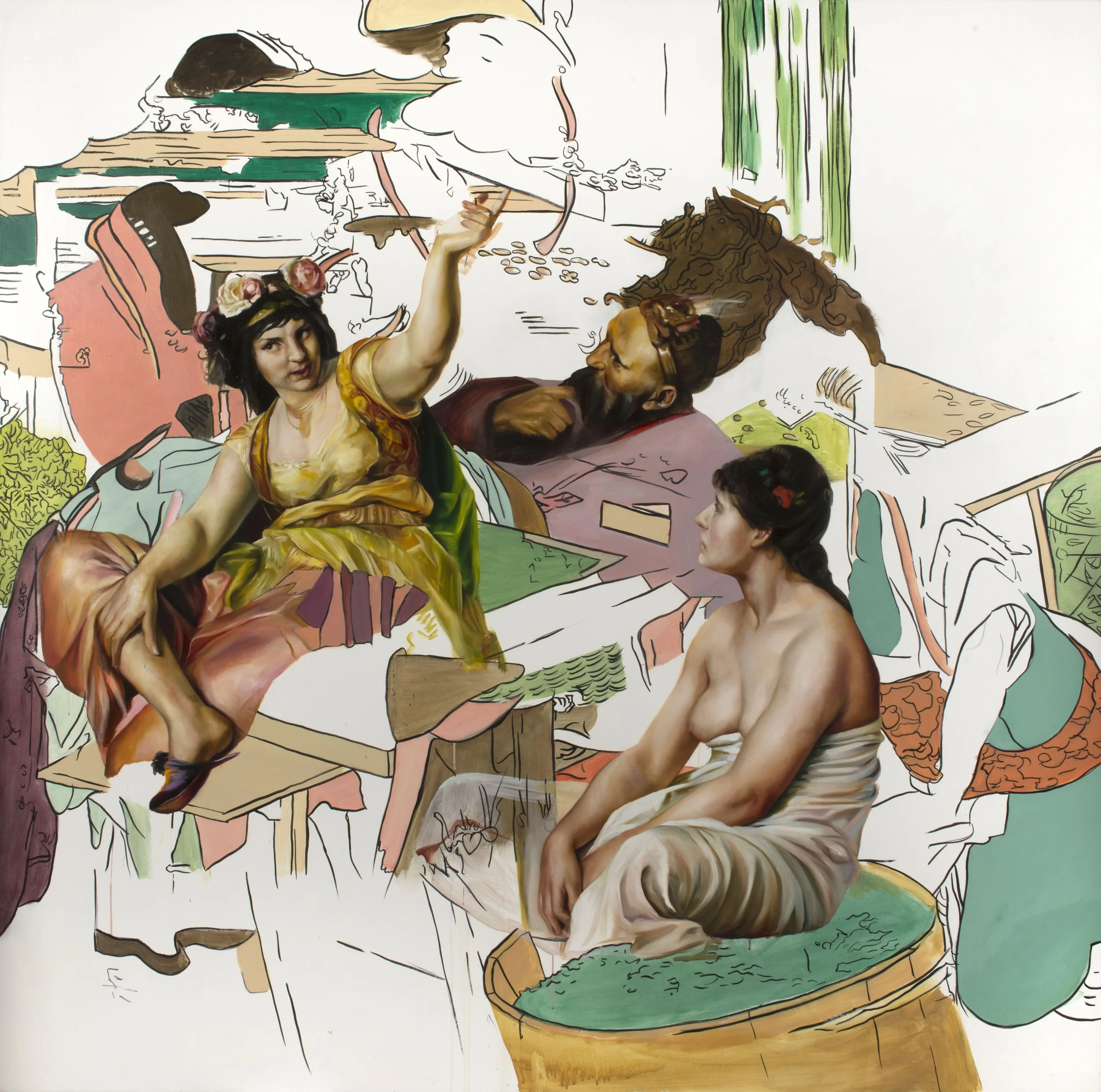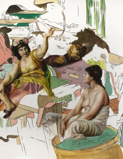 Plucked from old master works, or straight from New York history, the heroines of these artworks have been removed from their original contexts and gifted autonomy within the dreamscape-like realms of Fraleigh’s paintings. These immersive painted environments combine swirling abstract spaces and bold voids of color—the seen with the unseen. Fleshy forms are obscured by vibrant pours of color or lavish gold-leaf designs, while turned heads and cropped faces tease mysterious narratives of desire and whispered secrets.