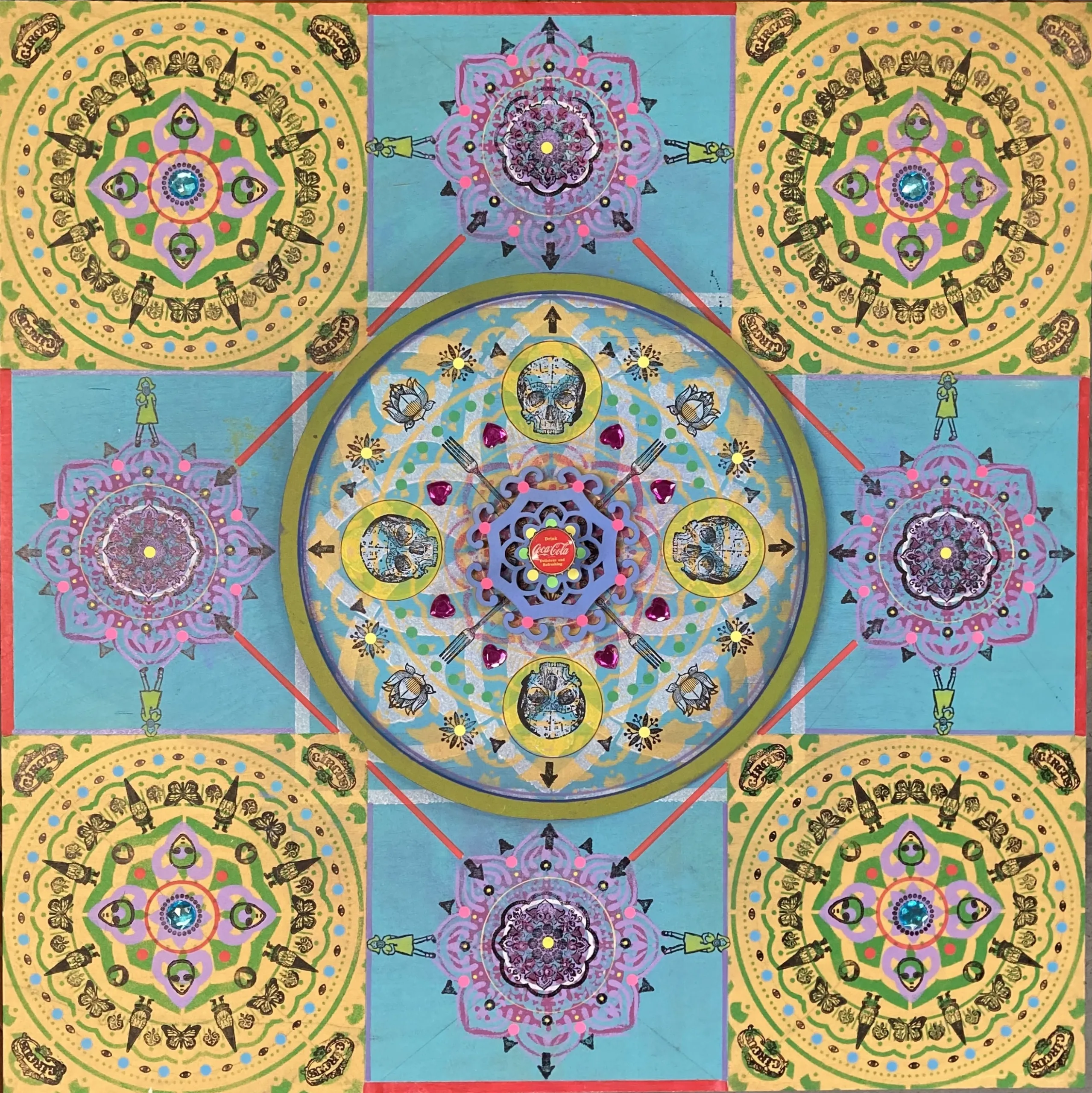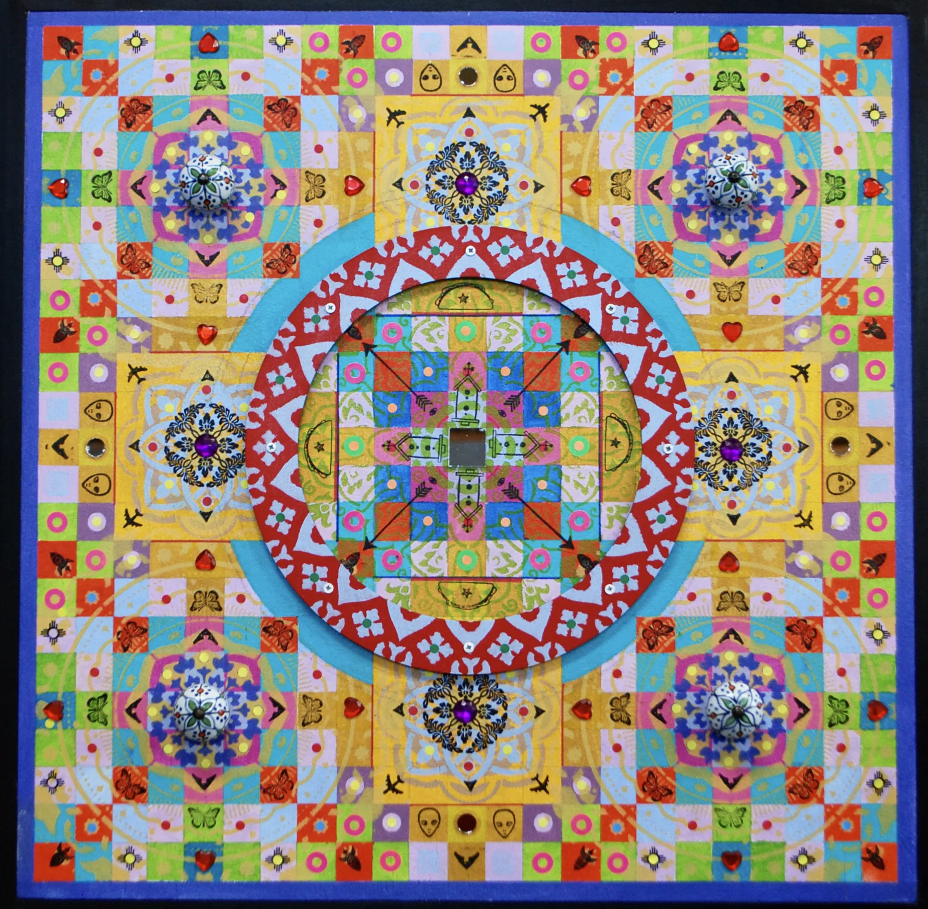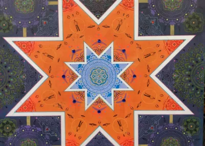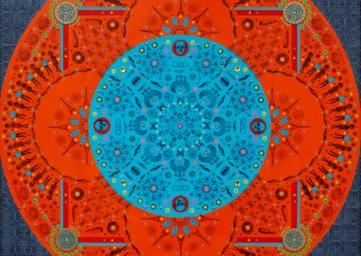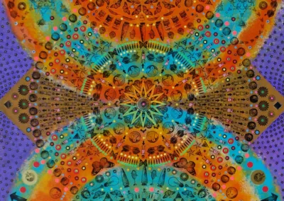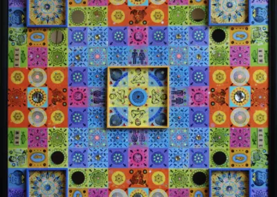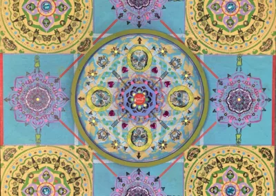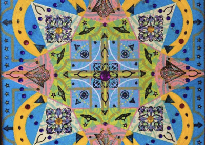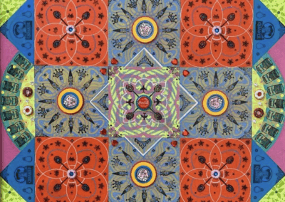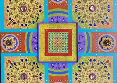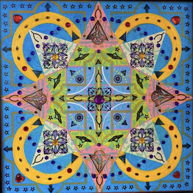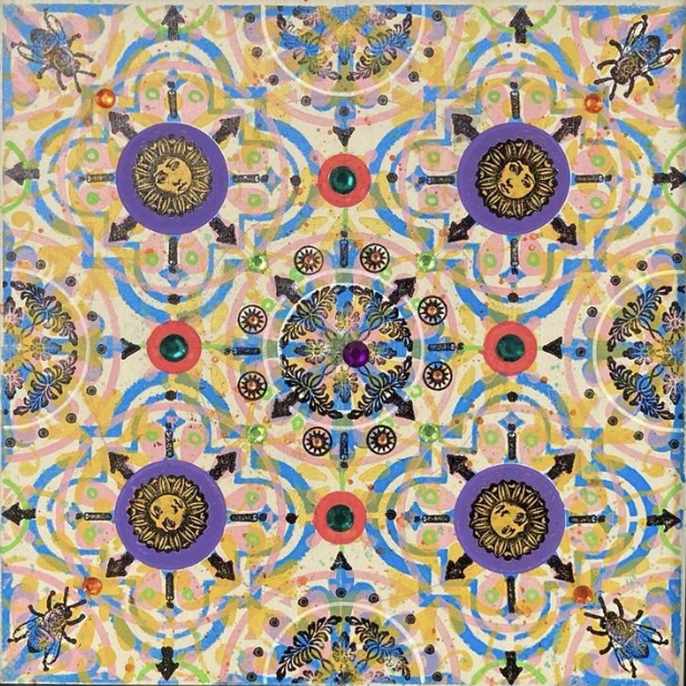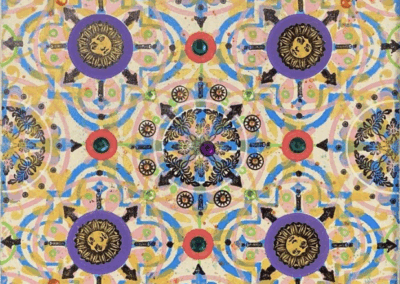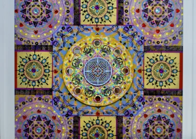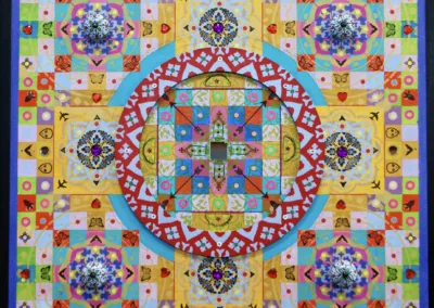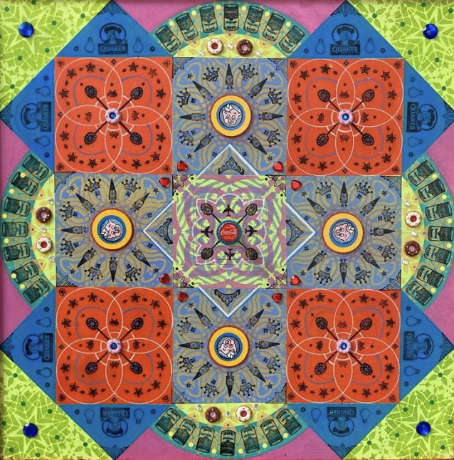 Gombert combines decorative art-making traditions from across the globe. Medieval illuminations, Celtic and Islamic patterns, textiles, bread-weaning, quilting patterns, symbols of Pop Cultures and stamps – all combined to create “Mandalas.” A Mandala is a geometric configuration of symbols. Eastern spiritual practices of Hinduism, Buddhism, Jainism, and Shinto mandalas are used to map prayers and energy movements. It represents the spiritual journey through layers from the outside to the inner core. For Gombert, this process is improvisational.