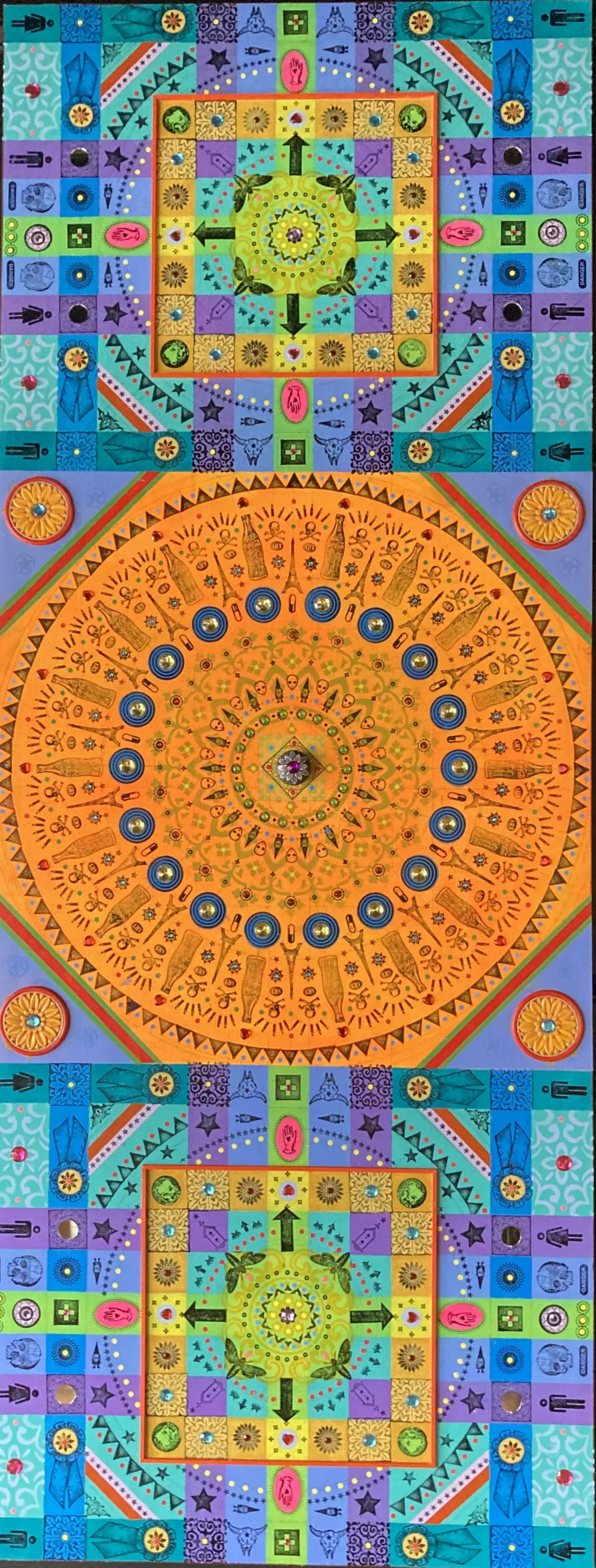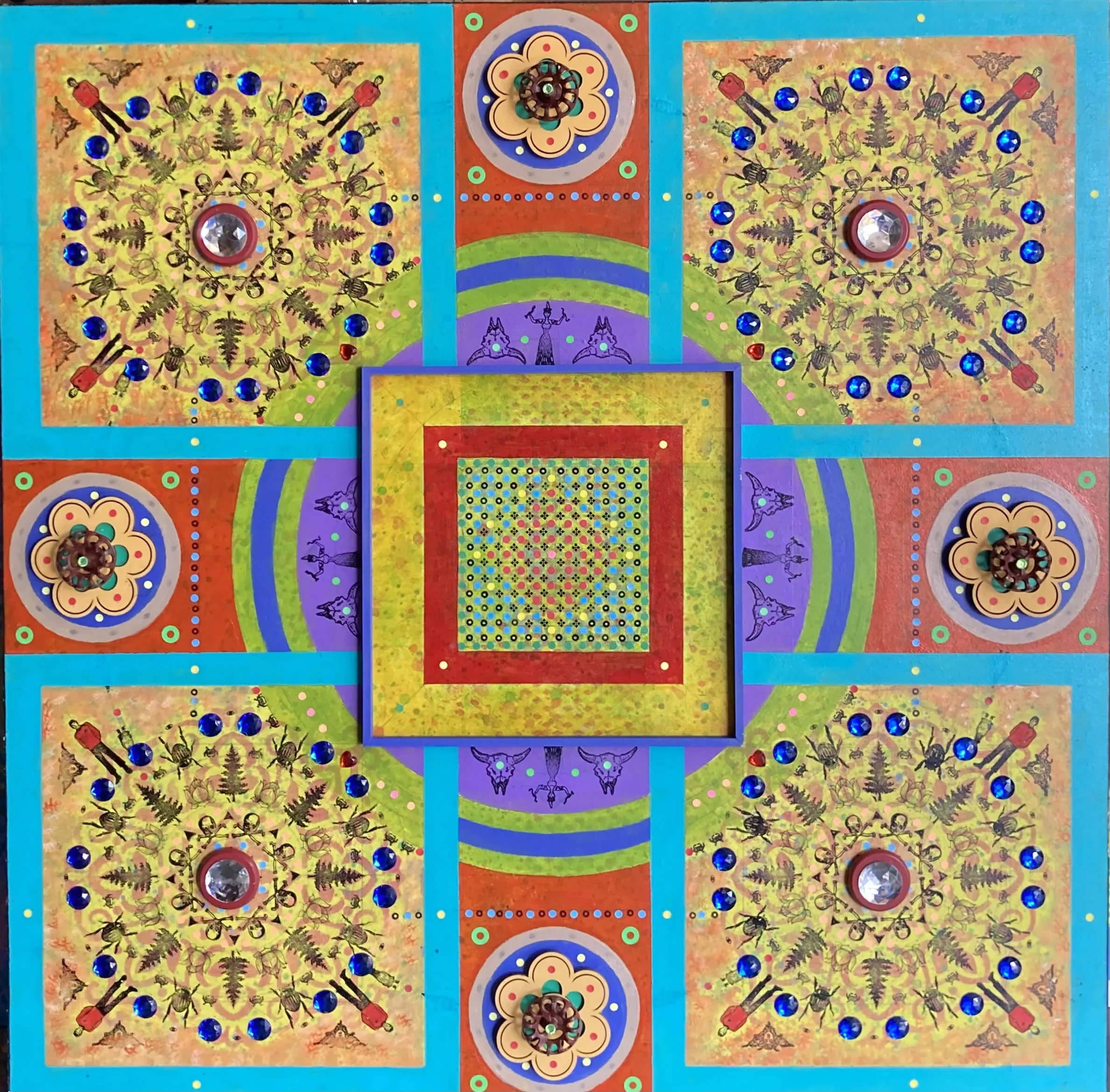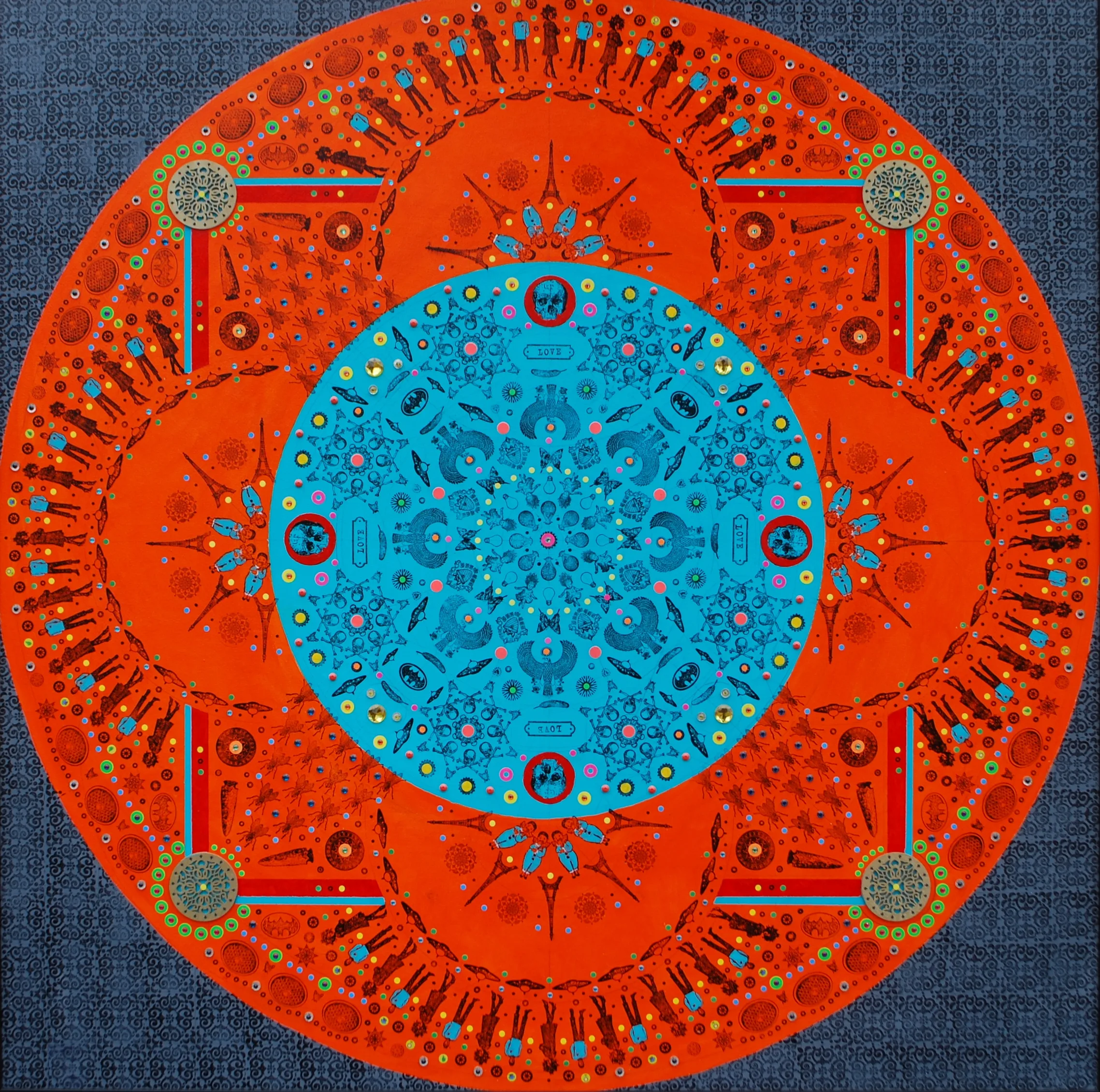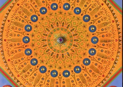 Gombert combines decorative art-making traditions from across the globe. Medieval illuminations, Celtic and Islamic patterns, textiles, bread-weaning, quilting patterns, symbols of Pop Cultures and stamps – all combined to create “Mandalas.” A Mandala is a geometric configuration of symbols. Eastern spiritual practices of Hinduism, Buddhism, Jainism, and Shinto mandalas are used to map prayers and energy movements. It represents the spiritual journey through layers from the outside to the inner core. For Gombert, this process is improvisational.