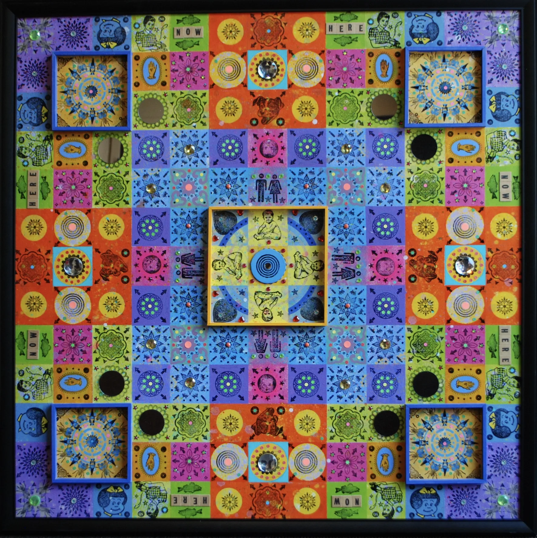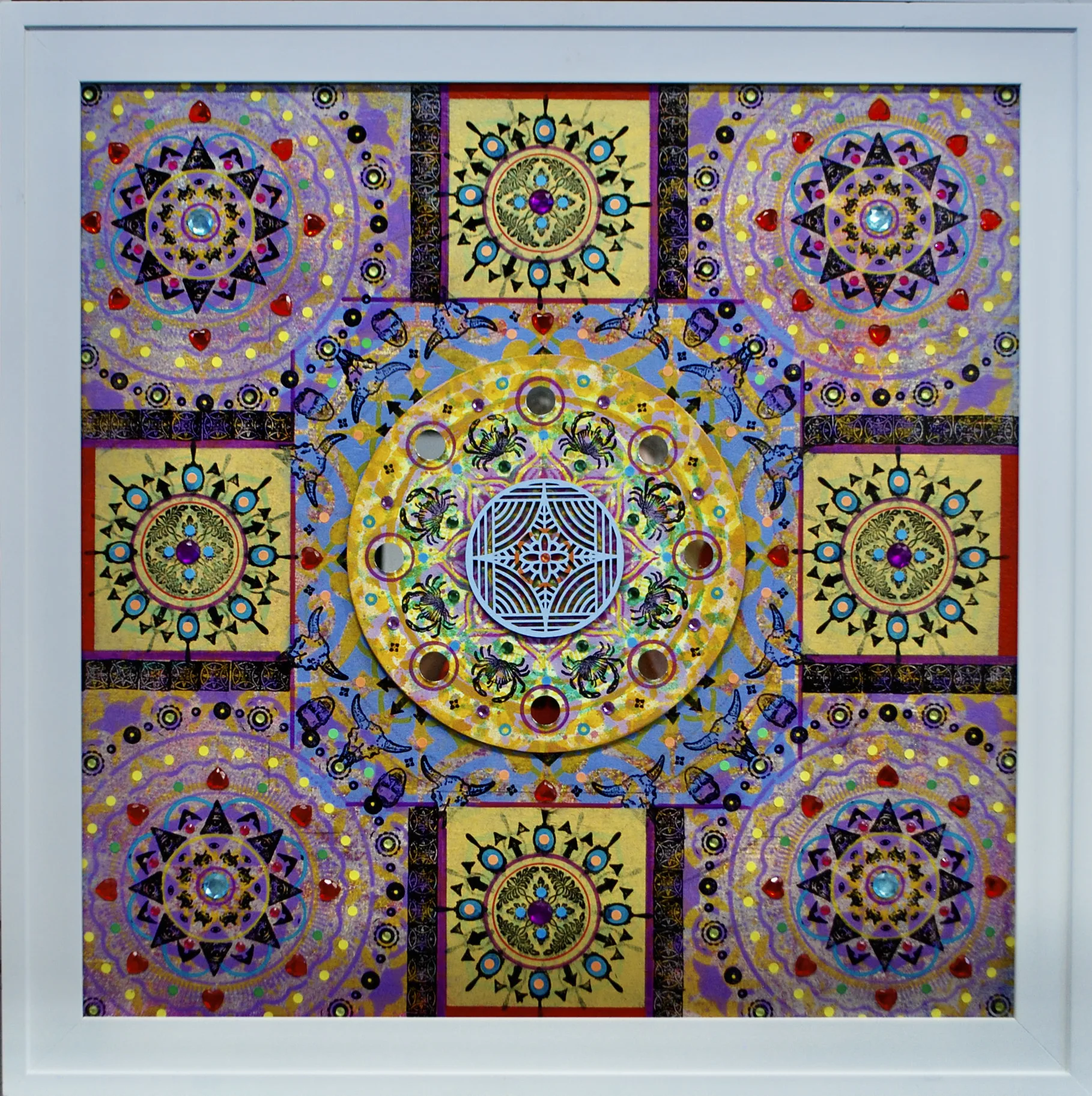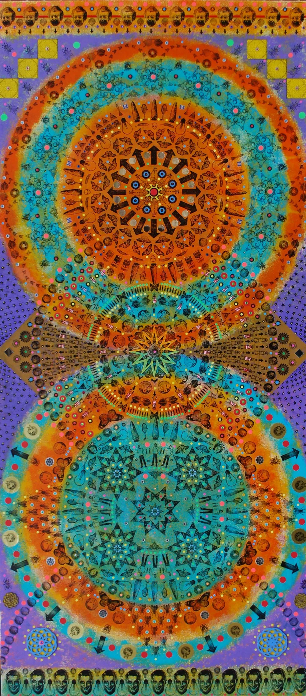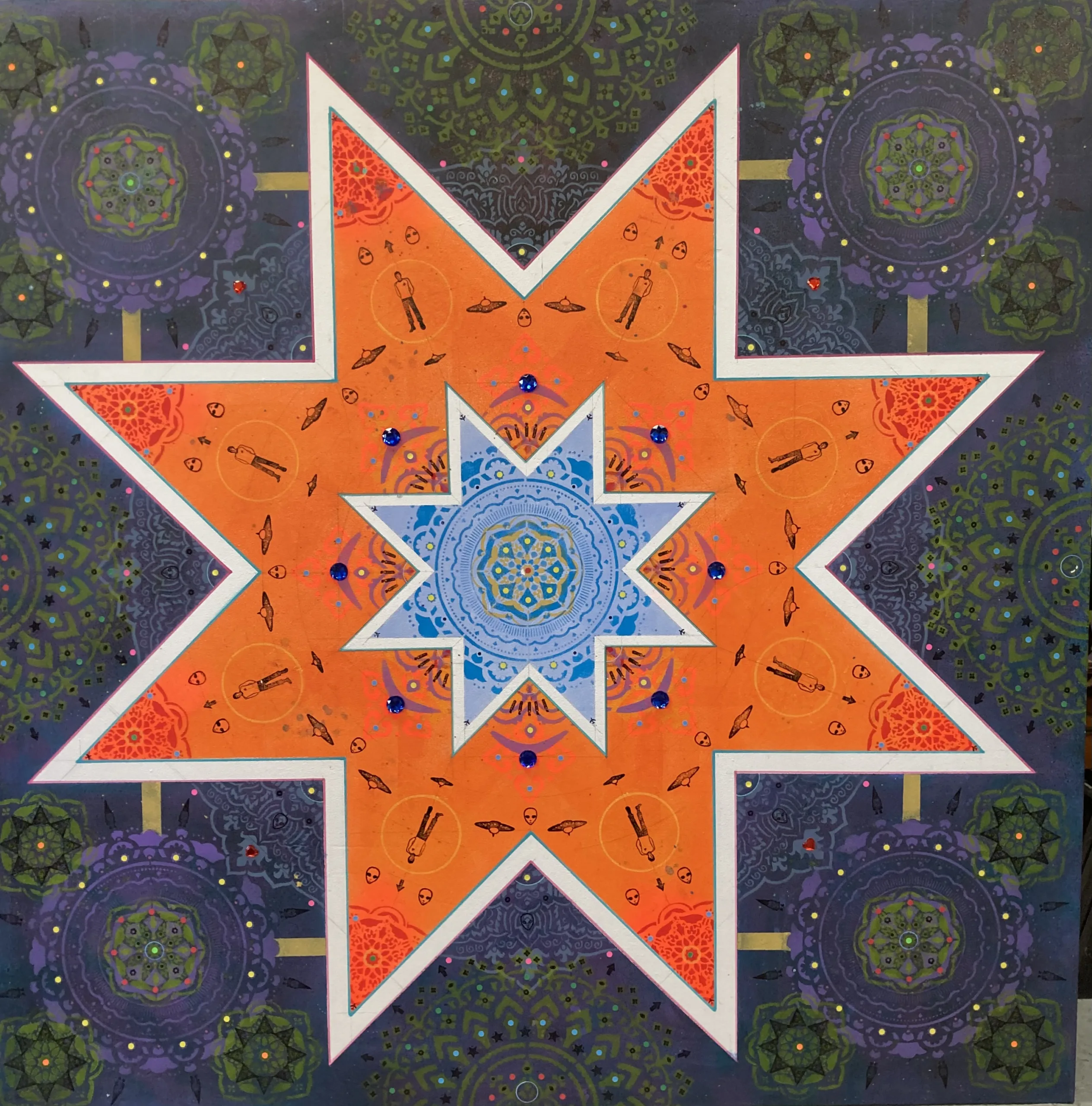 Gombert combines decorative art-making traditions from across the globe. Medieval illuminations, Celtic and Islamic patterns, textiles, bread-weaning, quilting patterns, symbols of Pop Cultures and stamps – all combined to create “Mandalas.” A Mandala is a geometric configuration of symbols. Eastern spiritual practices of Hinduism, Buddhism, Jainism, and Shinto mandalas are used to map prayers and energy movements. It represents the spiritual journey through layers from the outside to the inner core. For Gombert, this process is improvisational.