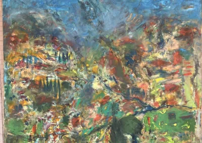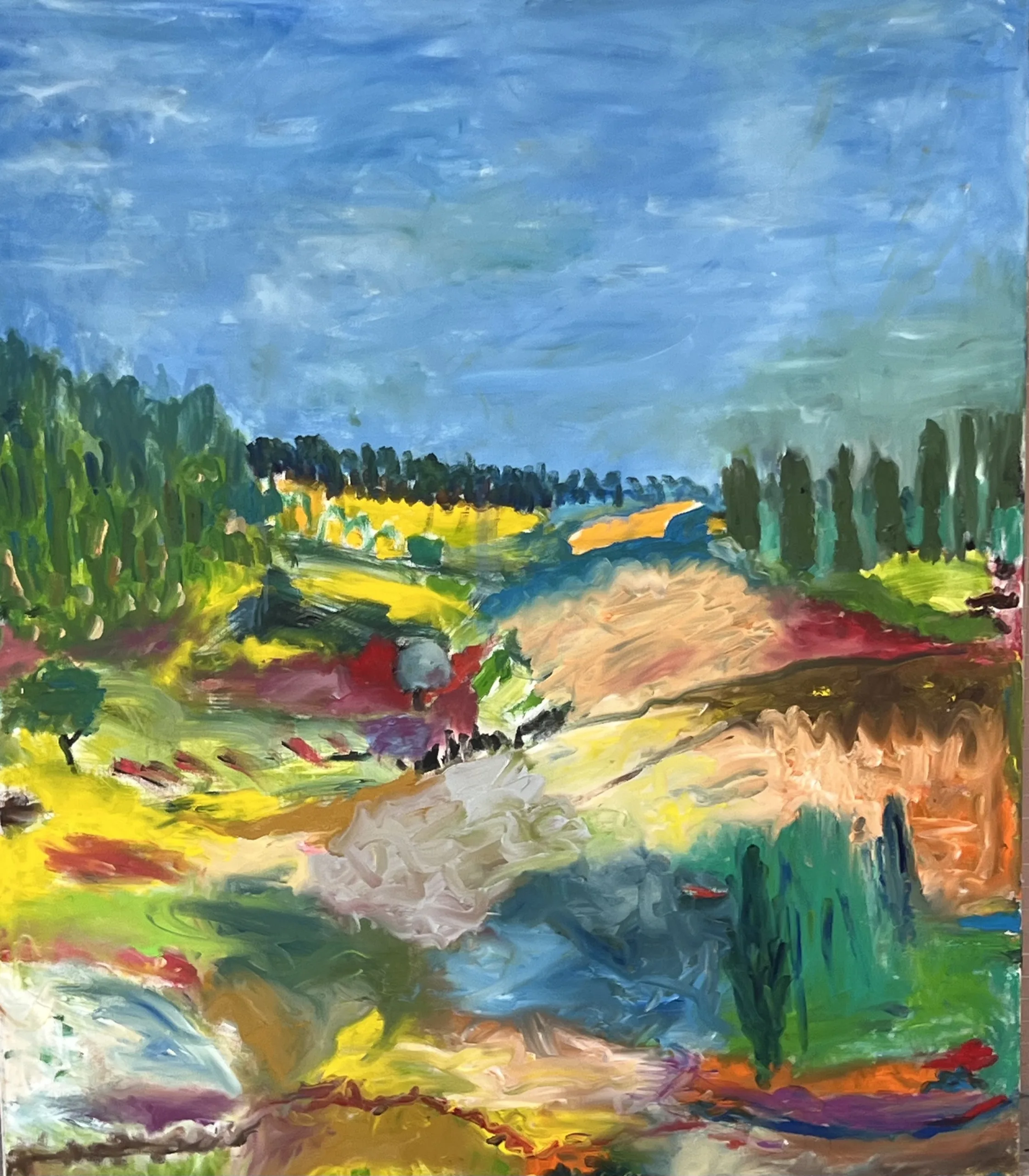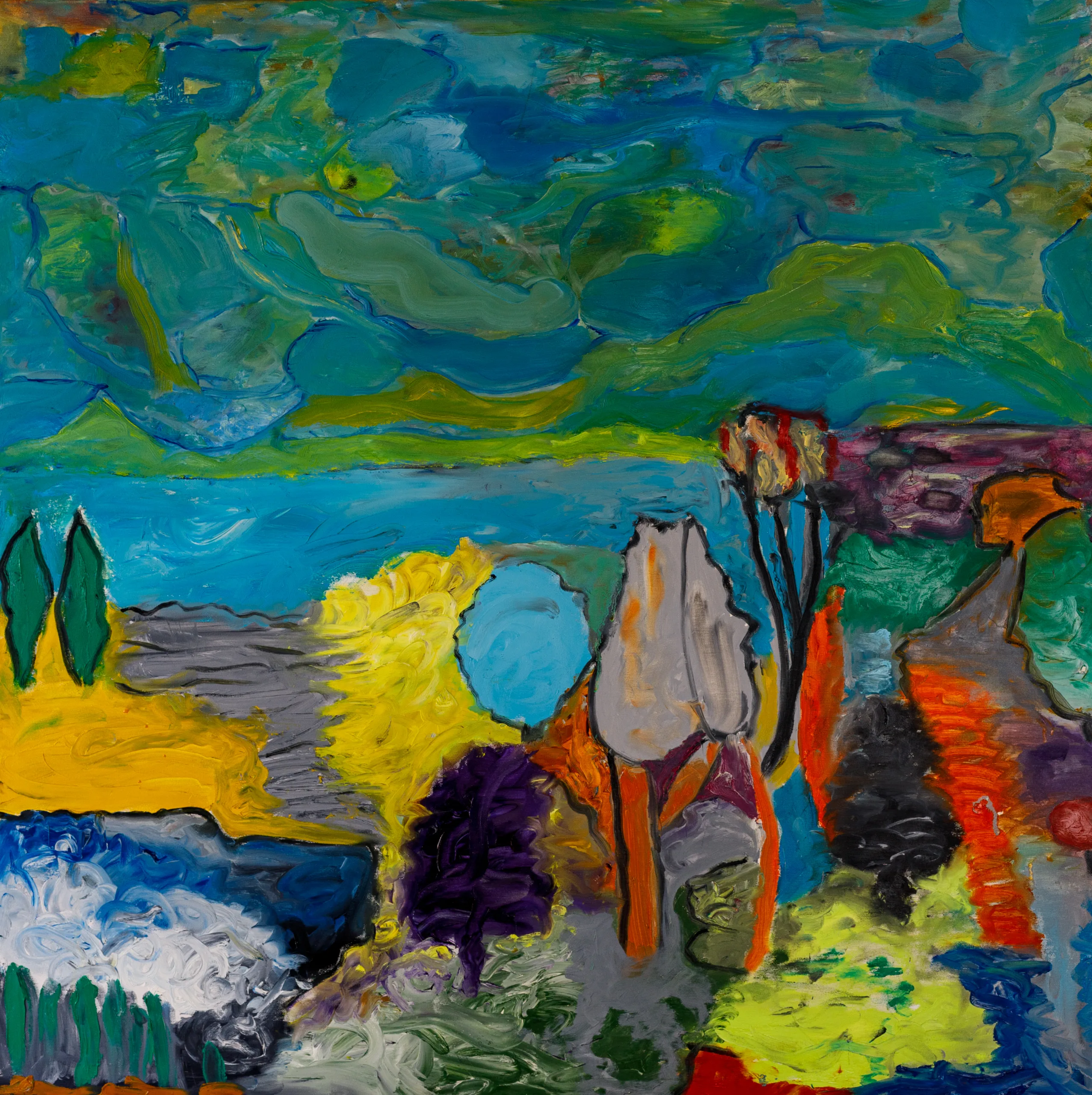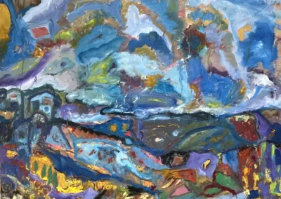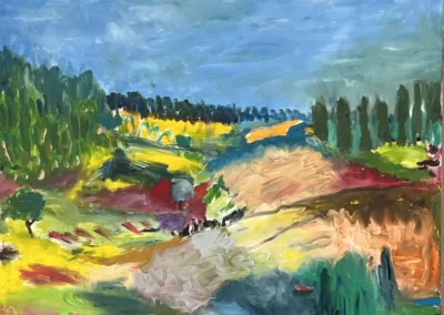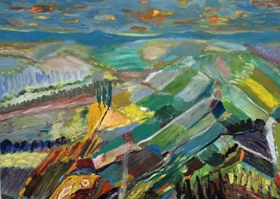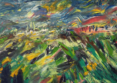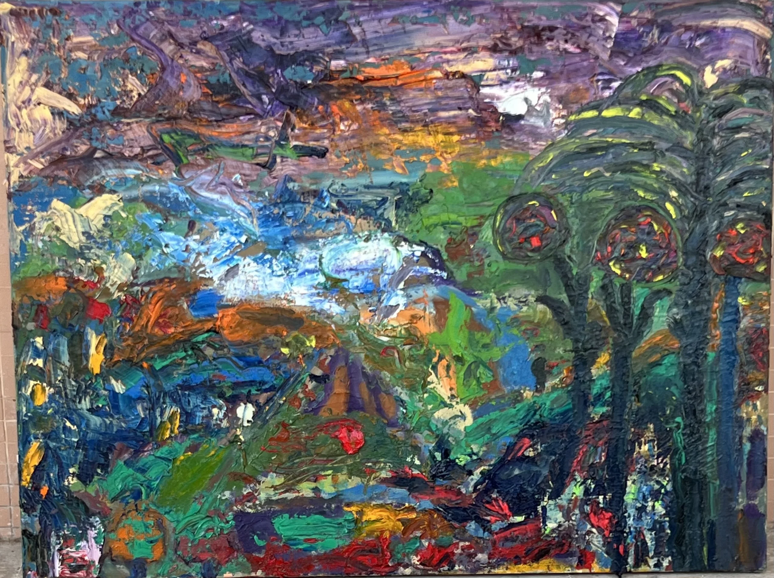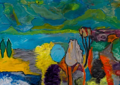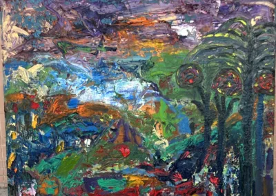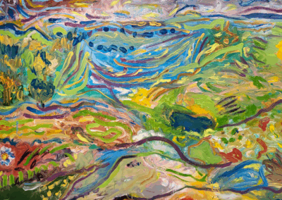 Painting the landscape of the Israel, Ashman weaves vivid colors of spring dancing with lines and strokes. Working with traditional oils on canvas, the landscape transforms into inner movement, portraying his moods and hopes. Ashman strives to feel complete with nature as nature brings the potential of life-giving food, medicine, peace, and joy.