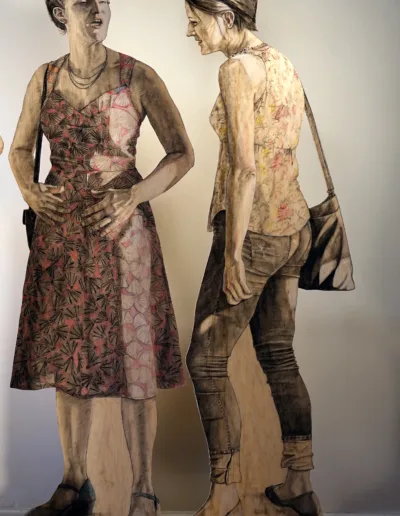 Stewart-Sanabria is also known for her life size charcoal portrait drawings on plywood, which are cut out, mounted on wood bases, and staged in conceptual installations. Most of Stewart-Sanabria’s reference material comes from observing people at art receptions. People give off subtle clues as to the culture and social groupings they inhabit. When a group of people inhabit a space, they observe certain territorial rules that govern where they are and what direction they are moving in relation to where others are located. They form predictable geometric patterns that are replicated in everything from the herding and flocking behaviors of other species, to wild seed and plant scatterings, to even star and constellation patterns.