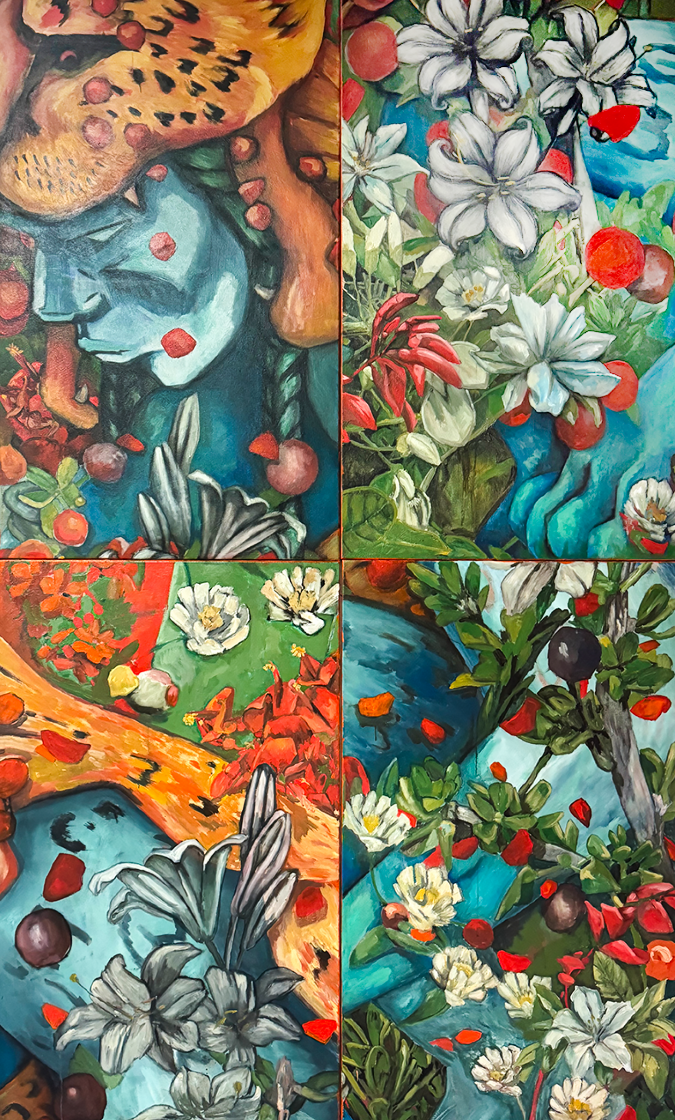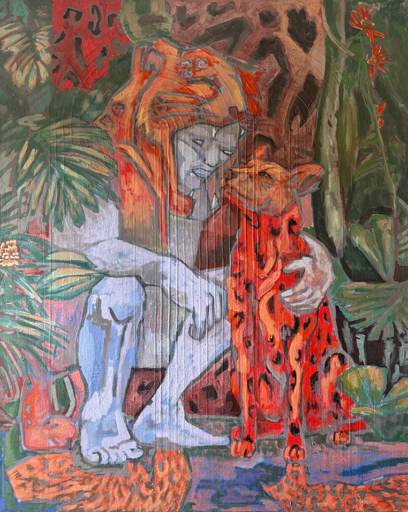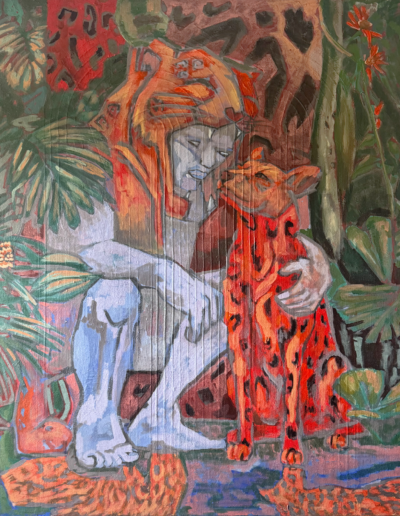 Rozas’ original paintings and recent work explores the last Uturunko tiger, a traditional folk tale from the northern regions of Argentina. It tells the story of a young man that can transform into a leopard/tiger-like being during full moon nights. He used the old skin of a leopard brought by people marching down south with an Inca army during the time just before their contact with the Spaniards. Rozas reinterprets the tale in visual form with fresco-inspired techniques.