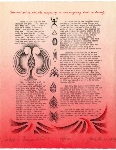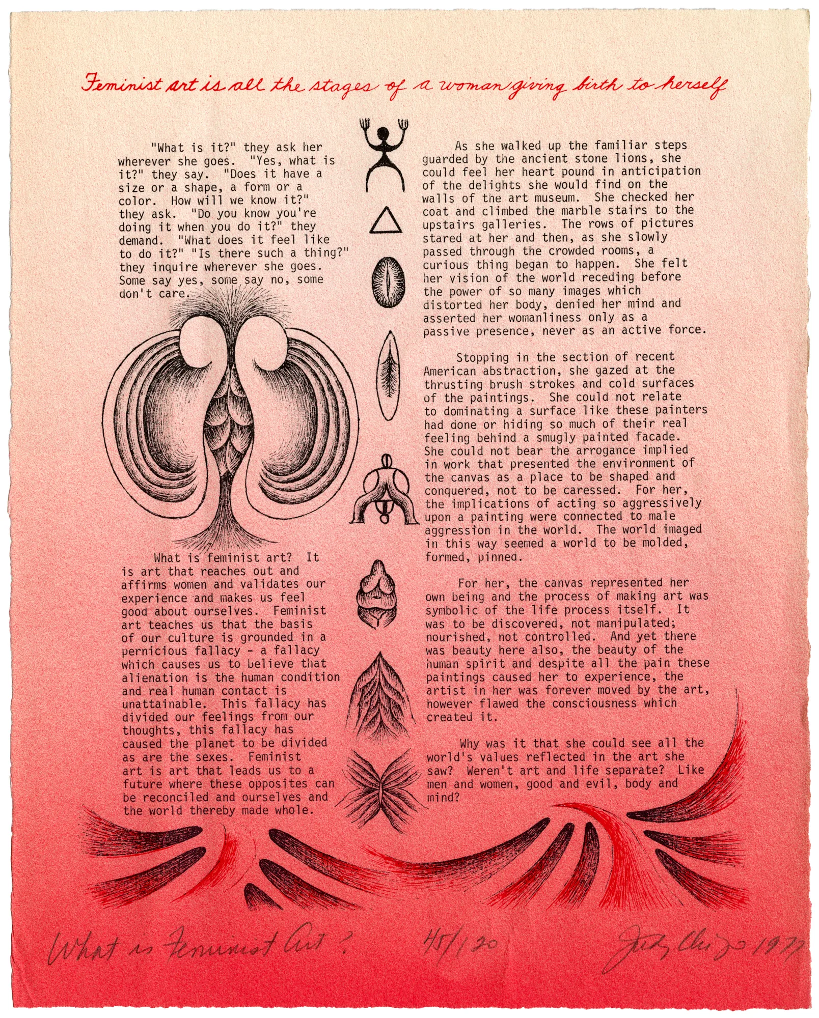 Chicago founded the first feminist arts education program in the United States at California State University, Fresno, then at the California Institute of the Arts a year later. As a connection to feminist activists involved in second-wave feminism of the 1960s and 70s, her autobiography, The Flowering, is introduced in a foreword by Gloria Steinem. Some of the many institutions where her work has been collected and exhibited include the British Museum, Tate Modern, Muzeum Susch (Switzerland), Centre Pompidou (Paris), Whitney Museum, Los Angeles County Museum of Art, Museum of Contemporary Art Los Angeles, Hammer Museum, Getty Trust and Getty Research Institute, San Francisco Museum of Modern Art, Crystal Bridges Museum of American Art, Art Institute of Chicago, the Smithsonian American Art Museum, and the National Museum of Women in the Arts.
