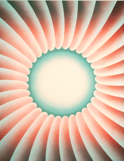 Chicago explores a variety of media and often works with materials that have been considered “women’s craft” such as ceramics, weaving, and needlepoint. Her early engagement with the Californian Light and Space Movement in the 1960s influenced her signature geometric floral pieces, abstractions of glowing color, which represent the physical forms of women. The resulting works, her series Through the Flower,investigate representations of femininity and womanhood, the foundations of her artistic practice.